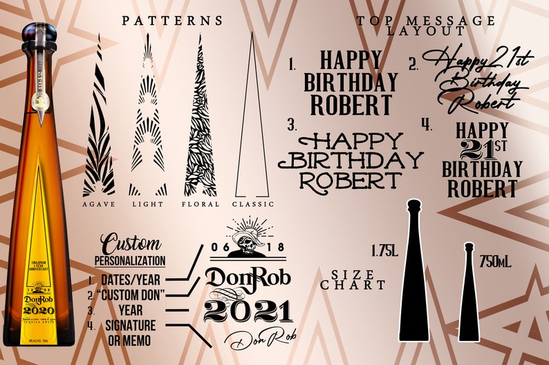 Personalized Don Julio Tequila Birthday Labels | Labelyourlife These custom Don Julio labels fit a 375mL or 750mL bottle (bottle not included!). The labels print on waterproof adhesive vinyl and are slightly oversize to fit over the top of existing labels, should you choose not to remove the old one. This listing includes art for one image only.