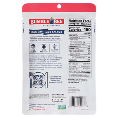 Bumble Bee Pink Salmon in Water 5oz Can | Garden Grocer For inquires concerning product include number shown on can end.GF, gluten free.100% recyclable packaging.Per 56g serving:60 calories.0.5g sat fat, 2% DV.180mg sodium, 8% DV.0g sugars.See side panel for full nutrition facts. . Other Products In This Category Chicken of the Sea Chunk Light Tuna in Spring Water 5 oz. Can Nutrition Facts for Bumble Bee Skinless & Boneless Atlantic Salmon Bumble Bee Skinless & Boneless Atlantic Salmon Canned. Drained. Nutrition Facts Serving Size can 1 can = 142g Amount Per Serving 220 Calories % Daily Value* 22% Total Fat 14g 13% Saturated Fat 2.5g Trans Fat 0g 25% Cholesterol 75mg 18% Sodium 420mg 0% Total Carbohydrate 0g 0% Dietary Fiber 0g Total Sugars 0g 0% Includes 0g Added Sugars Protein 23g