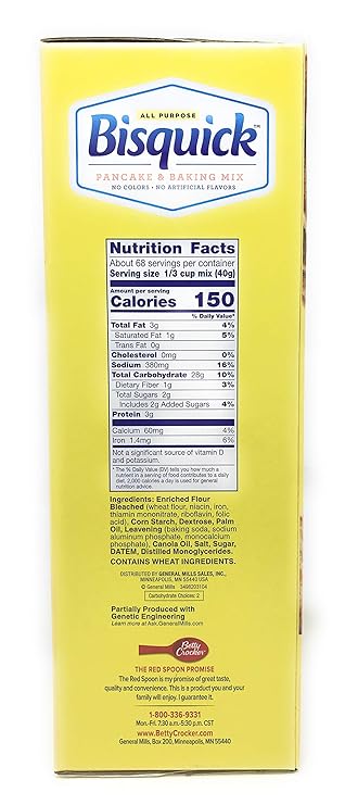 Carbs in Bisquick Original Pancake & Baking Mix Nutritional Facts · Calories. 150 kCal · Total Carbs. 28 g. Net Carbs. 27 g. Fiber. 1 g. Starch. -. Sugar. 2 g. Sugar Alcohols. - · Protein. 3 g · Fat. 3 g. Bisquick™ Gluten Free Pancake & Baking Mix - BettyCrocker.com Make quick and easy family breakfast favorites with Betty Crocker Bisquick Gluten Free Pancake & Baking Mix. This versatile baking mix can be used for biscuits, muffins, pancakes, waffles and even pie. From hot, fluffy pancakes to mouthwatering waffles, bake restaurant-worthy gluten-free breakfast dishes with this all-purpose baking mix. Just add milk, oil and eggs to start crafting a family ... Bisquick™ Heart Smart™ Pancake & Baking Mix - BettyCrocker.com Nutrition Facts Prep Instructions HEART SMART™ PANCAKES MAKES 14 PANCAKES YOU WILL NEED: 2 CUPS HEART SMART BISQUICK™ MIX 1 1/4 CUPS FAT-FREE (SKIM) MILK 1 EGG · STIR ingredients until blended. · POUR by slightly less than 1/4 cupfuls onto hot greased griddle. · COOK until edges are dry; about 1 minute 30 seconds. Nutrition and ingredients - General Mills Our nutrition experts focus on a variety of areas ranging from nutrition density, personalized nutrition, whole grain, cereal, yogurt, dietary intake research and beyond. Global Health Reporting Over the years, we have made significant progress reformulating products by increasing positive nutrients, like whole grain, fiber and iron, and reducing limiters, like sodium and sugar.