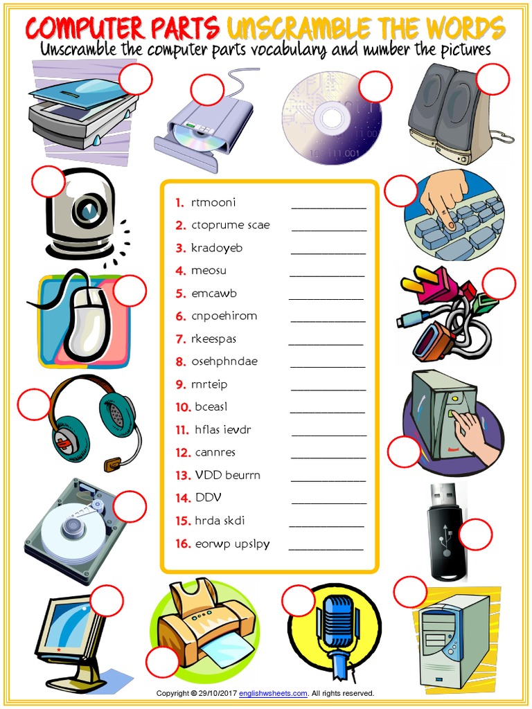 Parts of the computer worksheet. Student Edition Complete - University of Cincinnati Introduction Welcome to CustomGuide: Computer Basics. CustomGuide courseware allows instructors to create and print manuals that contain the specific lessons that best meet their students’ needs. › computer-worksheet-forComputer Worksheet for Class 2 | Practice Questions for Kids Jul 29, 2022 · Parts of a computer. 1. What are the parts of a computer? We will learn the parts of a desktop computer. The main parts of a desktop computer are the monitor, CPU, keyboard, and mouse. First, let’s understand what a monitor is. A monitor is a screen that helps us navigate on a computer. › parts-of-the-brain-for-kidsParts of the Brain Activity for Kids, Brain Diagram, and ... Aug 03, 2021 · Brain worksheet for grade 2. Parts of the Brain Worksheet – Label the human brain by writing the number on the brain template; Label the Brain Parts Worksheet – Use the brain vocabulary from the word bank to label the brain areas; Brain Activity for kids. Next we made a 3d brain model for kids using playdough and this brain mold edu.gcfglobal.org › en › computerbasicsComputer Basics: Inside a Computer - GCFGlobal.org If you decide to open the computer case and take a look, make sure to unplug the computer first. Before touching the inside of the computer, you should touch a grounded metal object—or a metal part of the computer casing—to discharge any static buildup. Static electricity can be transmitted through the computer circuits, which can seriously ...