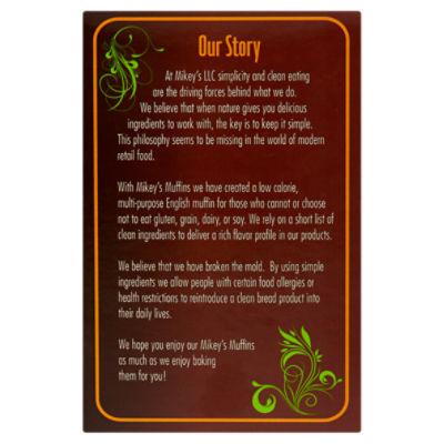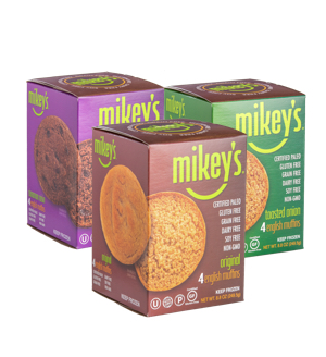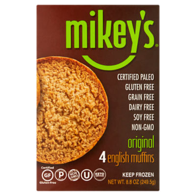 Mikey's Muffins Original English Muffins - Shop Bread at H-E-B In our Original Variety Mikey's Muffins it only takes six ingredients to make these toastable delights. Six, that it. Best part, you can pronounce all of them! Our Original Variety is all about versatility; they are perfect for breakfast, lunch, dinner, or just a snack. Paleo friendly. Gluten free. Dairy free. Soy free. Grain free. 95 cals each.