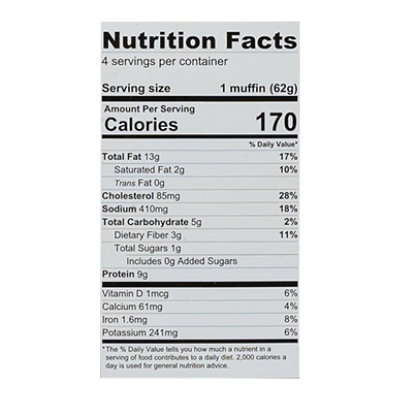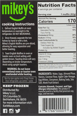 Buy MIKEYS MUFFINS Products at Whole Foods Market Find your favorite MIKEYS MUFFINS products at Whole Foods Market. Get nutrition facts, prices, and more. Order online or visit your nearest store. Mikey's Muffins Gluten Free English Muffins, Original, 8.8 Oz [4 Pack] Mikey's Muffins are a low calorie, paleo friendly, multi-purpose muffin, for those people who cannot or choose not to eat gluten, dairy, soy, or grain products. ... Nutritional Facts. Mikey's Muffins Gluten Free English Muffins, Original, 8.8 Oz [4 Pack] Reviews. Be the first to review this product. Write a review Hy-Vee Aisles Online Grocery Shopping Mikey's English Muffins, Cinnamon Raisin 4Ct, Log In to Add to Cart, Ingredients & Nutrition Facts, Water, Eggs, Almond Flour, Raisins, Coconut Flour, Apple Cider Vinegar, Egg Whites, Cinnamon, Baking Soda, Sea Salt, Monk Fruit Extract, Contains Almonds, Coconut, and Eggs. Product Details, Description, Taste the love the taste. Mikey's Muffins Original English Muffins, 4 ct / 2.2 oz - Kroger Serving size0.5english muffin (31 g) Amount per serving, Calories 86, % Daily value*, Total Fat 6g 7.69%, Saturated Fat 1g 5%, Trans Fat 0g, Cholesterol 50mg 16.67%, Sodium 120mg 5.22%, Total Carbohydrate 4g 1.45%, Dietary Fiber 2g 7.14%, Sugar 0g, Protein 4g, Calcium 52mg 4%, Iron 0.9mg 6%, Potassium 148mg 4%, Vitamin D 0mcg 0%,