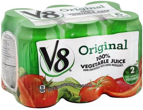 V8 100% Original Spicy Hot Vegetable Juice - 8-5.5 FZ - Safeway Eight (8) pack of 5.5 fl oz cans of V8 Spicy Hot 100% Vegetable Juice V8 juice is a unique, satisfying and nutrient-rich juice with a zesty kick Gluten free, Non-GMO V8 vegetable juice contains vitamin A and vitamin C These drinks are perfect for post workout recovery drinks, afternoon snacks and even cocktail mix