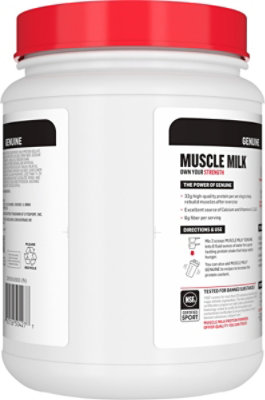 MUSCLE MILK® GENUINE Protein Powder | Muscle Milk© MUSCLE MILK GENUINE Protein Powder 32 grams of high-quality protein to help support muscle rebuilding, muscle growth, and maintenance of muscle mass 2-4 grams of sugar Excellent source of Calcium and Vitamins A, C, & D Tested for banned substances & NSF Certified for Sport Benefits Sustained energy