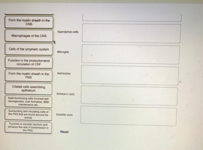 Label the glial cells of the cns. B cell depletion therapies in autoimmune disease: advances ... In spite of early successes in open-label trials, an anti-CD20 antibody ... In terms of CNS-resident B cells, ... is found on glial cells, ... Six Types of Neuroglia | Sciencing Four of them are present in the CNS: Astrocyte Oligodendrocyte Microglia Ependymal cell Two of them are present in the PNS: Satellite cell Schwann cell Satellite cells function to provide nutrients and protection to neurons in the PNS. A satellite glial cell wraps itself around the neuron's cell body. glial cells of CNS and PNS Flashcards | Quizlet four types of glial cells in CNS Astrocytes, Ependymal cells , Microglia, Oligodendrocytes stucture of astrocytes star-shaped glial cells with processes the extend from the cell body to form foot processes fuction of foot process in astrocytes cover the surface of blood vessels and neurons Astrocytes vital function formation of functional synapses Nervous System: Explore the Nerves with Interactive Anatomy … Web02.11.2020 · Myelin is formed by 2 types of glial cells: Schwann cells in the PNS and oligodendrocytes in the CNS. In both cases, the glial cells wrap their plasma membrane around the axon many times to form a thick covering of lipids. The development of these myelin sheaths is known as myelination. Myelination speeds up the movement of APs in …