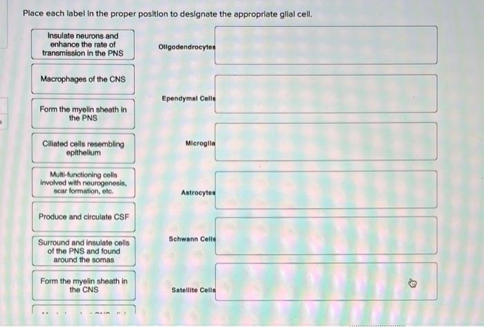 Label the glial cells of the CNS. Ependymal cell Oligodendrocyte ... Label gital cells in the CNS by clicking and dragging the label to the correct location. Label the glial cells in the CNS by clicking and dragging the label to the correct location. Posted 7 months ago View Answer Plagiarism Checker Submit your documents and get free Plagiarism report Free Plagiarism Checker X