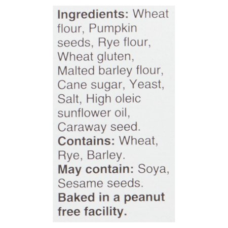 Boulangerie Grissol Melba Toast Rye with Seeds, Dare Ingredients: Wheat flour, Pumpkin seeds, Rye flour, Wheat gluten, Malted barley flour, Cane sugar, Yeast, Salt, High oleic sunflower oil, Caraway seed. Contains: Wheat, Rye, Barley. May contain: Soya, Sesame seeds. Baked in a peanut free facility.