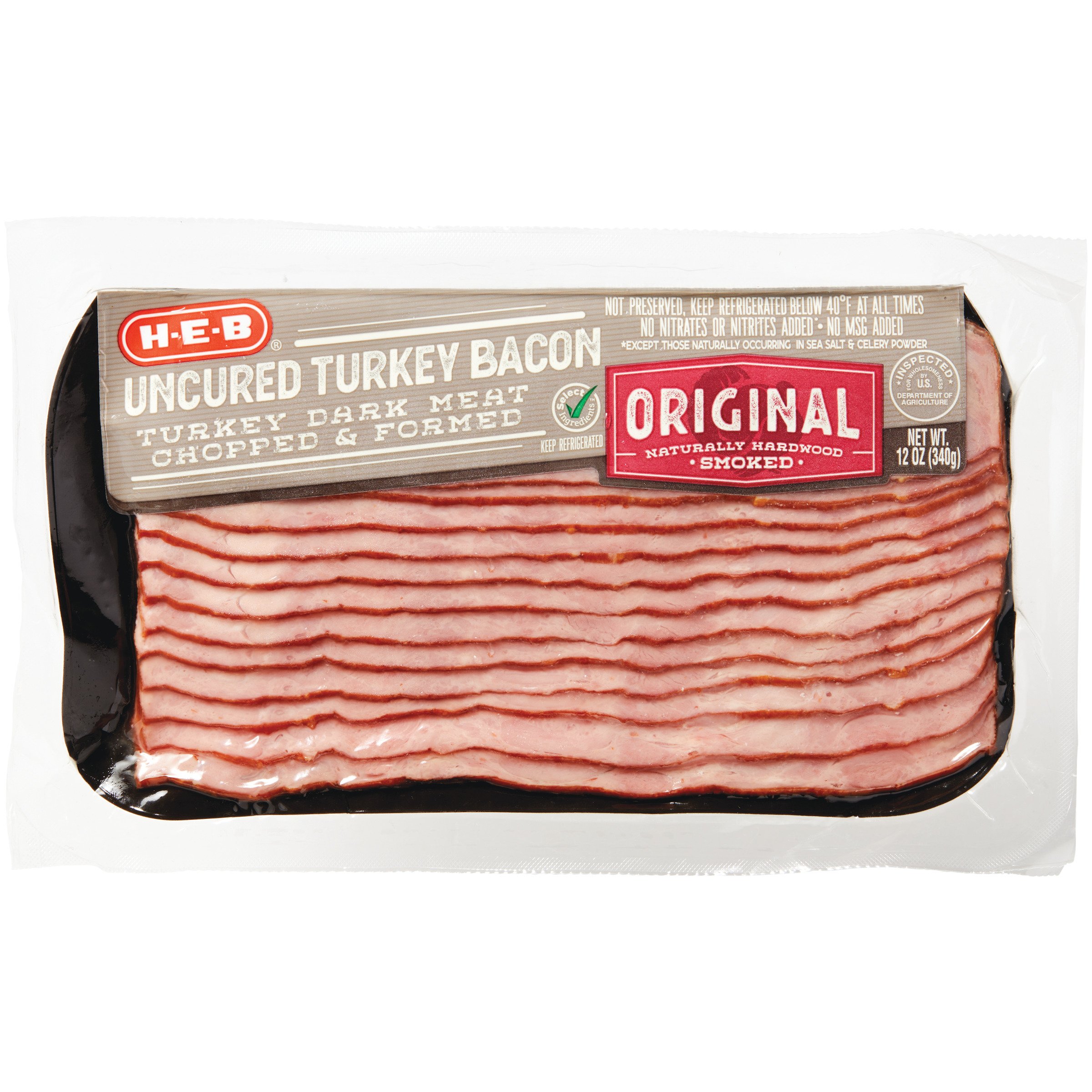 Oscar Mayer Selects Natural Uncured Turkey Bacon 57% Less ... Smoked uncured turkey chopped & formed, smoke flavor added. Per 1 Slice: 30 calories; 0.5 g sat fat (3% DV); 140 mg sodium (6% DV); 0 g sugars. Gluten free ...
